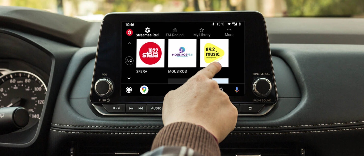 Το Streamee προσαρμόζεται ιδανικά στην οθόνη του αυτοκινήτου. Προσφέρει ένα σύγχρονο και μοντέρνο User Interface για κατανοητές και απλές επιλογές από την θέση οδήγησης.